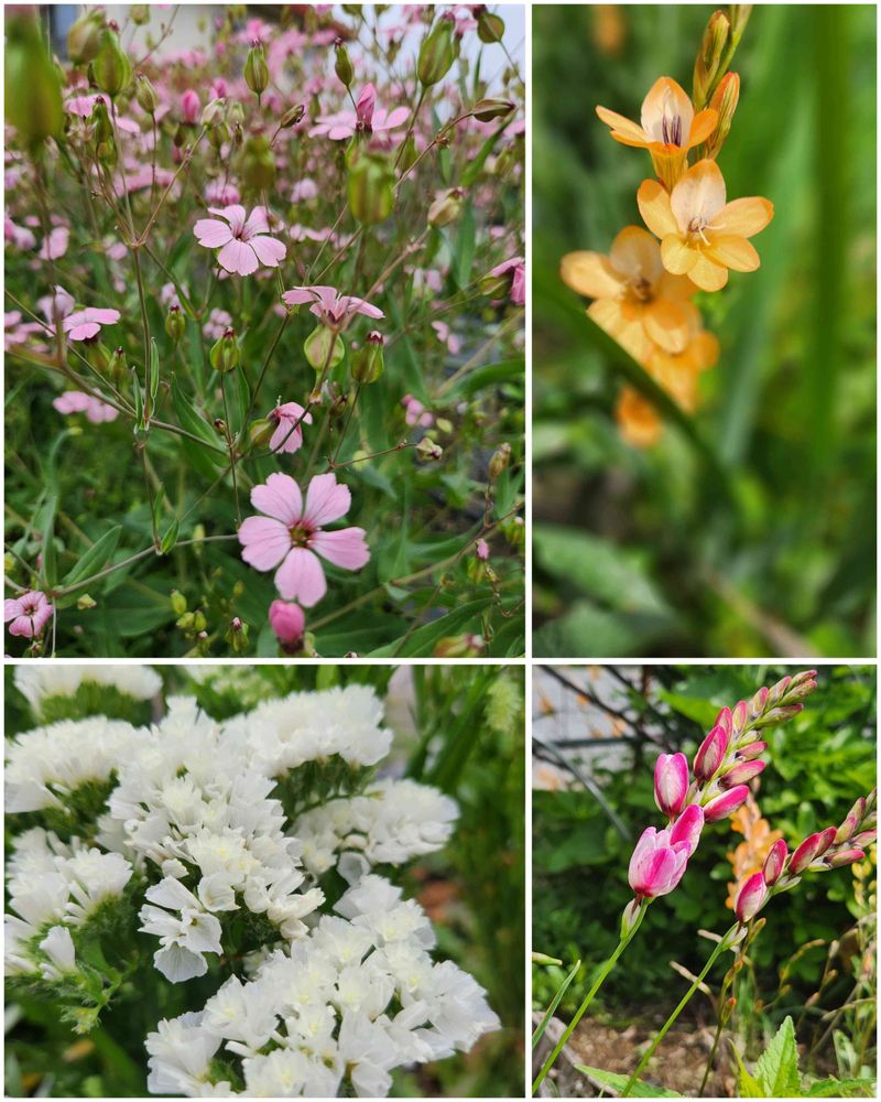 サポナリア、ワットソニア、イキシア、白いスターチス、満開です💠💛❤️💚💠。