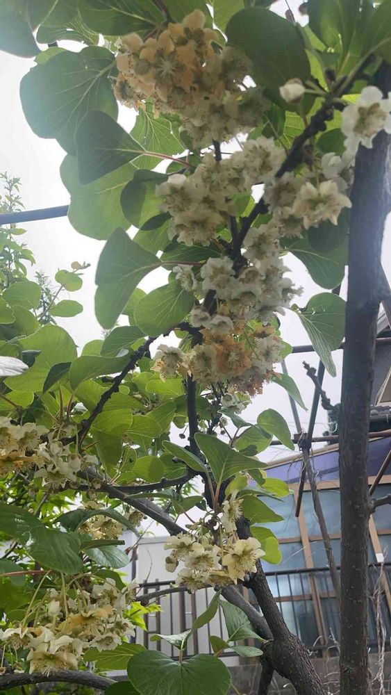 キウイフルーツ雌木(ゴールデンキング)満開、雄木(孫悟空)(早雄)現時点、蕾状態、開花1週間から10日ぐらい差有り、去年満開時採取花粉を冷凍保存、人工受粉試みました〜、花あわせ上手くいく事を願ってます。