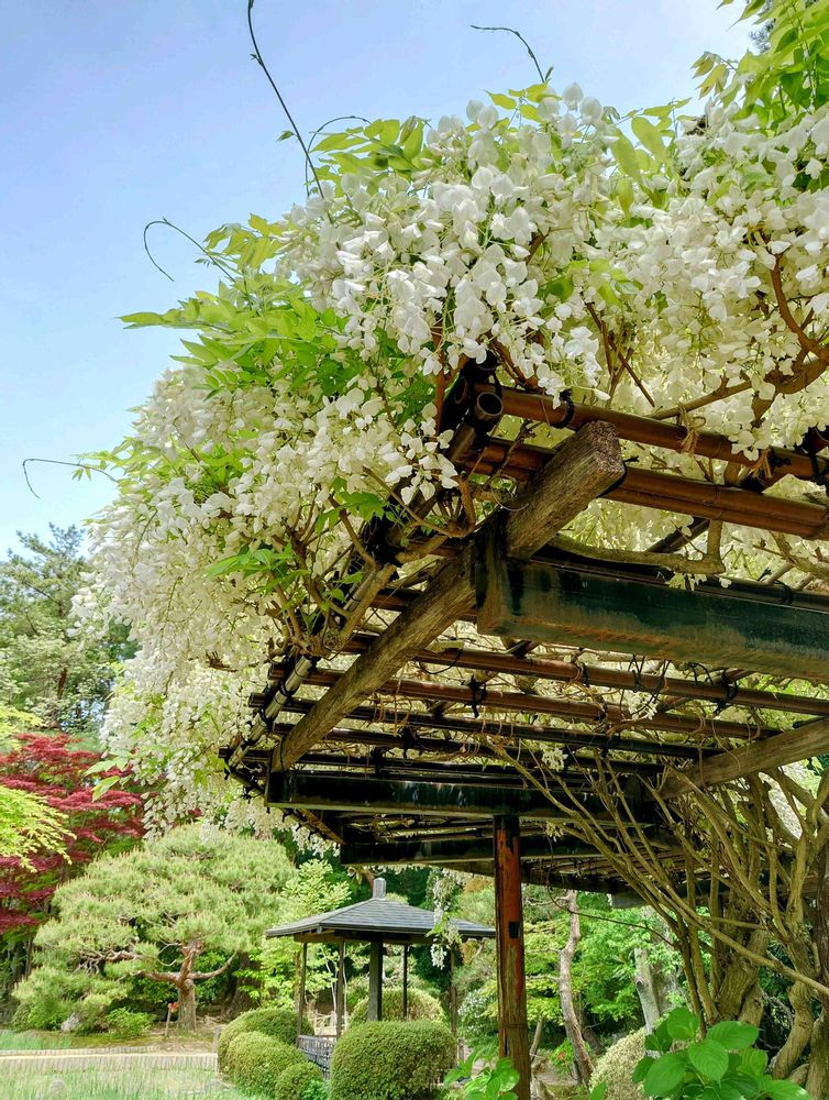 今日午前中、市内の寺院の庭園内で見かけた白い藤の花。
