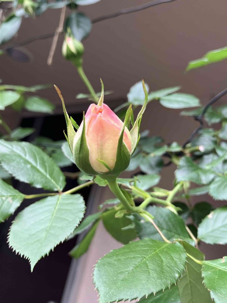この つぼみちゃん。バラの つぼみですが、わたしは 🍑ももに みえました。