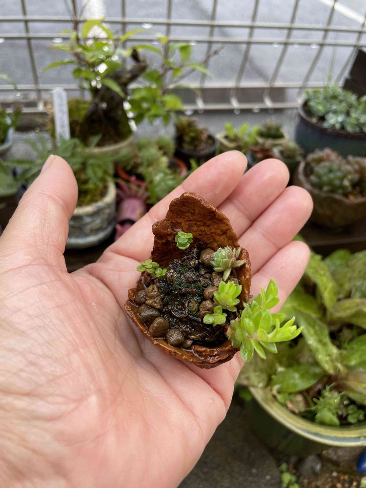 最近、山野草を始めました。旦那は盆栽、私は下草を学び始めました。 自宅で陶芸しています、豆鉢など作っています。の