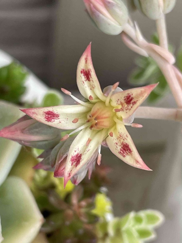 おはようございます😊多肉ちゃんのお花は星型やベル型で可愛らしいですよね🌸株が弱ると分かっていてもお花を最後まで咲かせてあげたくなります🤭