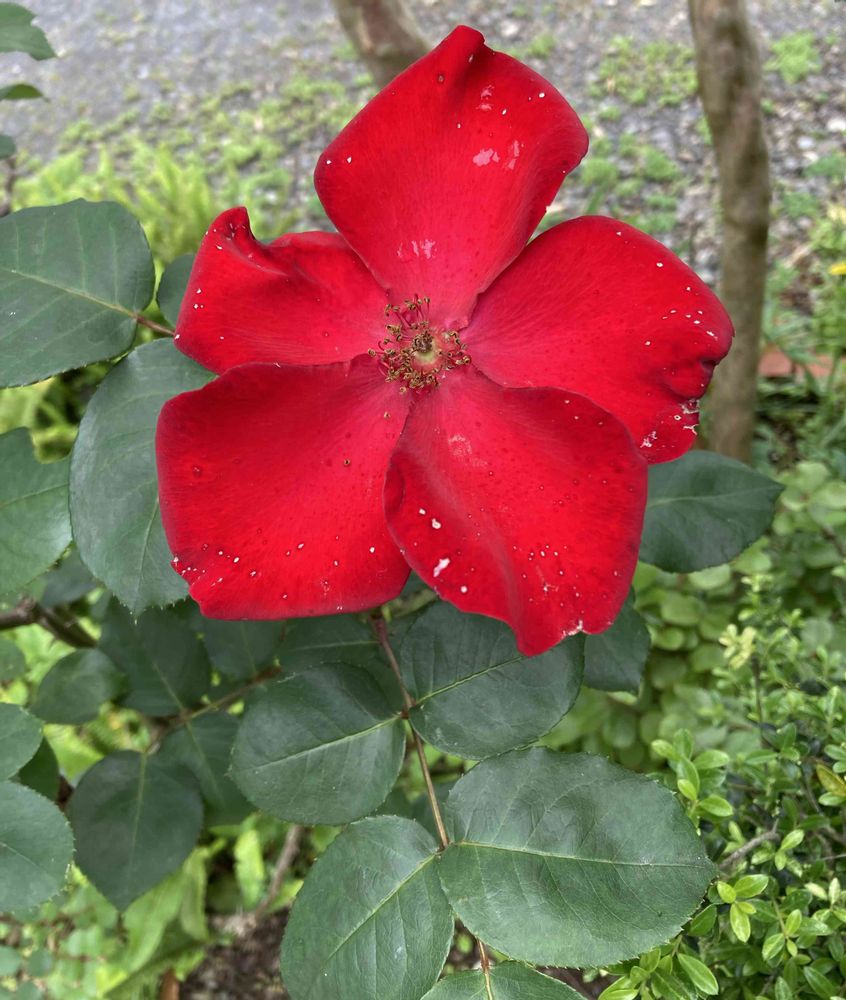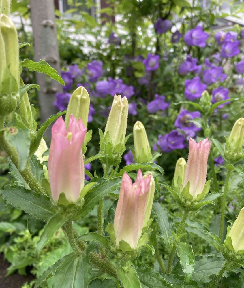 ミニバラ、一重の赤いバラ、カンパニュラのピンクも蕾が出て賑やかに