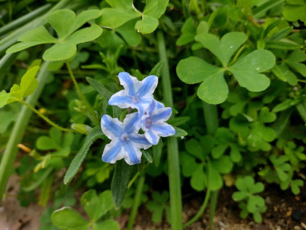 白とブルーの色合わせが爽やかなミヤマホタルカズラ。カタバミにだいぶ負けていますが💦、今年も無事咲いてくれました(^_-)-☆。
