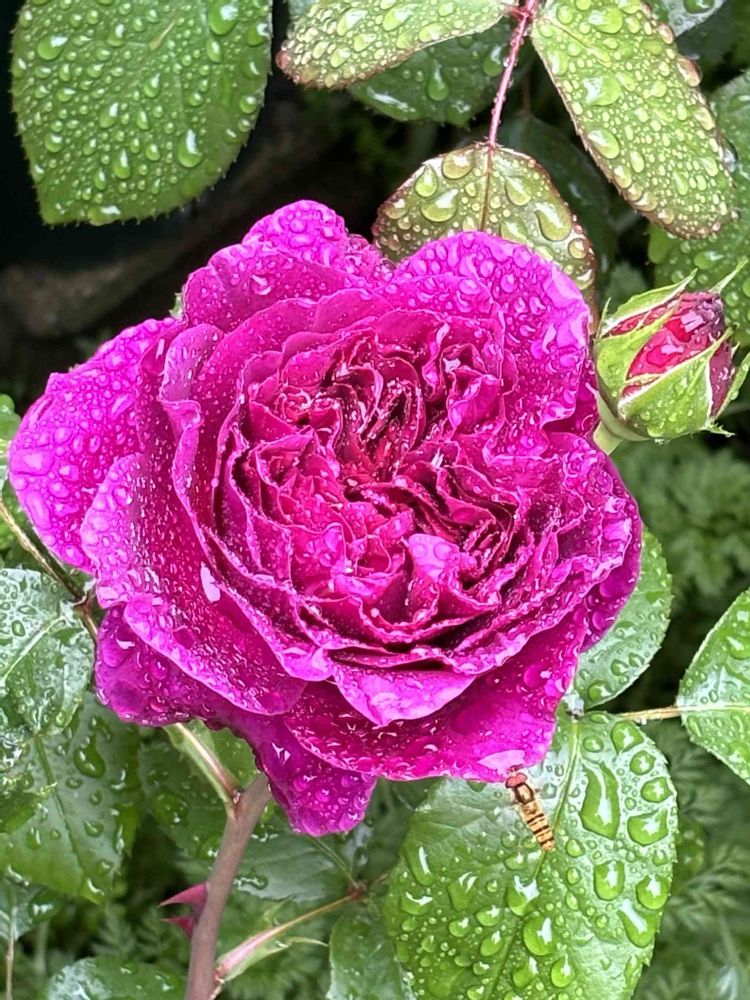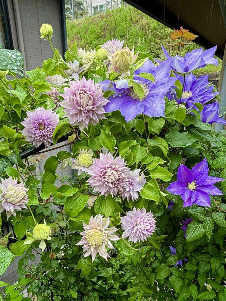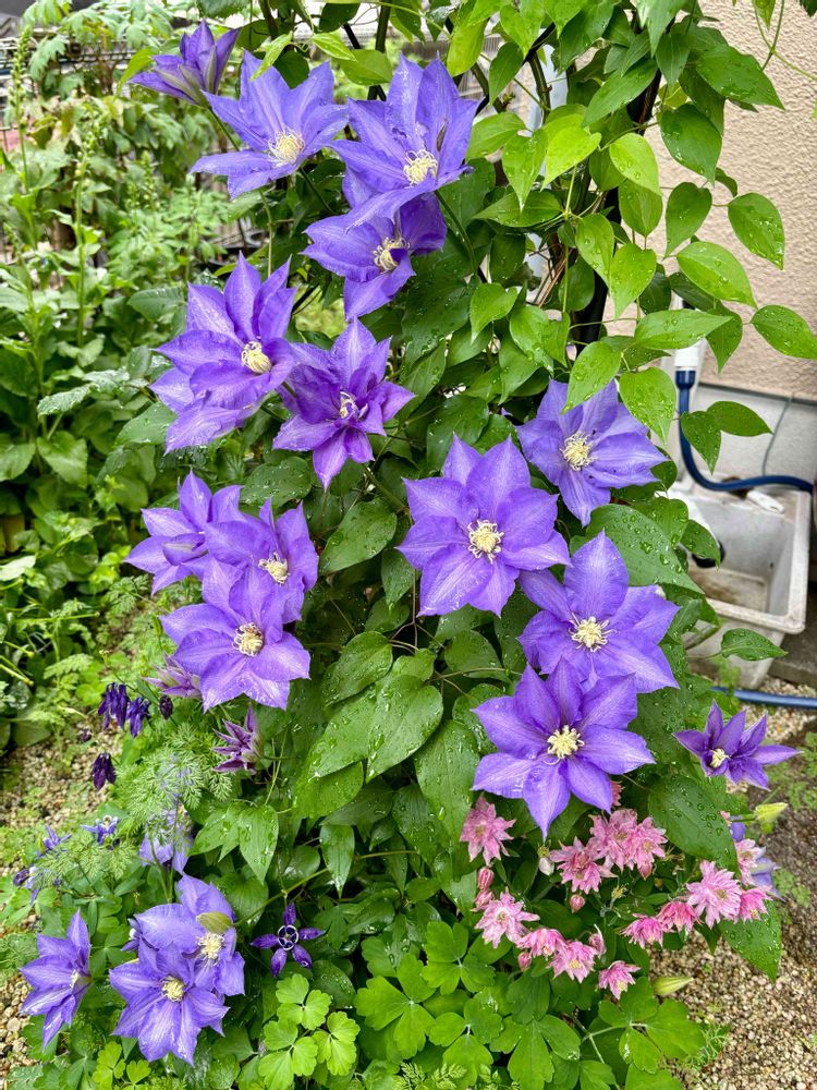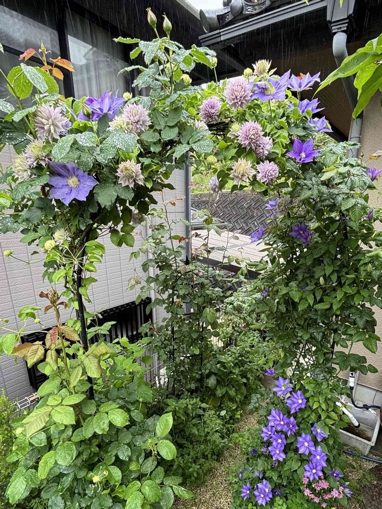 ☔️しとしと今日の庭💦雨が上がったら庭に入り浸ります🥰🌹🎵シャンソンが聴こえるような美しさと芳香のバラ💖そしてメルヘンのようなクレマチス🎵😍💕