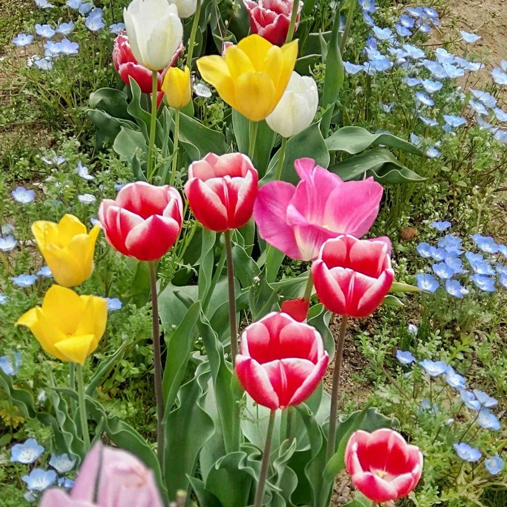 我が家のチューリップとネモフィラです。確かに、青いネモフィラなんてすが。此の後チューリップが枯れ始めたら、白いネモフィラが出ていました。
