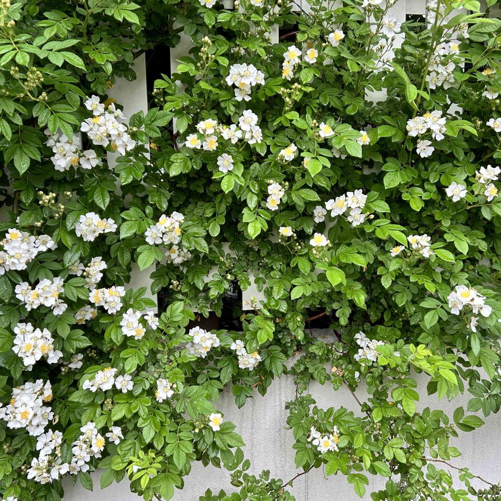 4枚目の白い柵からこぼれ出て咲いている白いお花は、ロサムルティフローラって子かな?