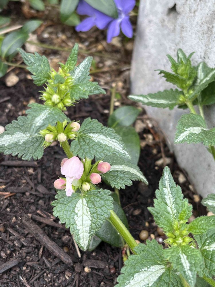 葉っぱのまま雪の下で冬を越したラミウムが咲き出しました 2枚目はラミウムピンクパール 3枚目はこれから開花を待っているラミウム達です