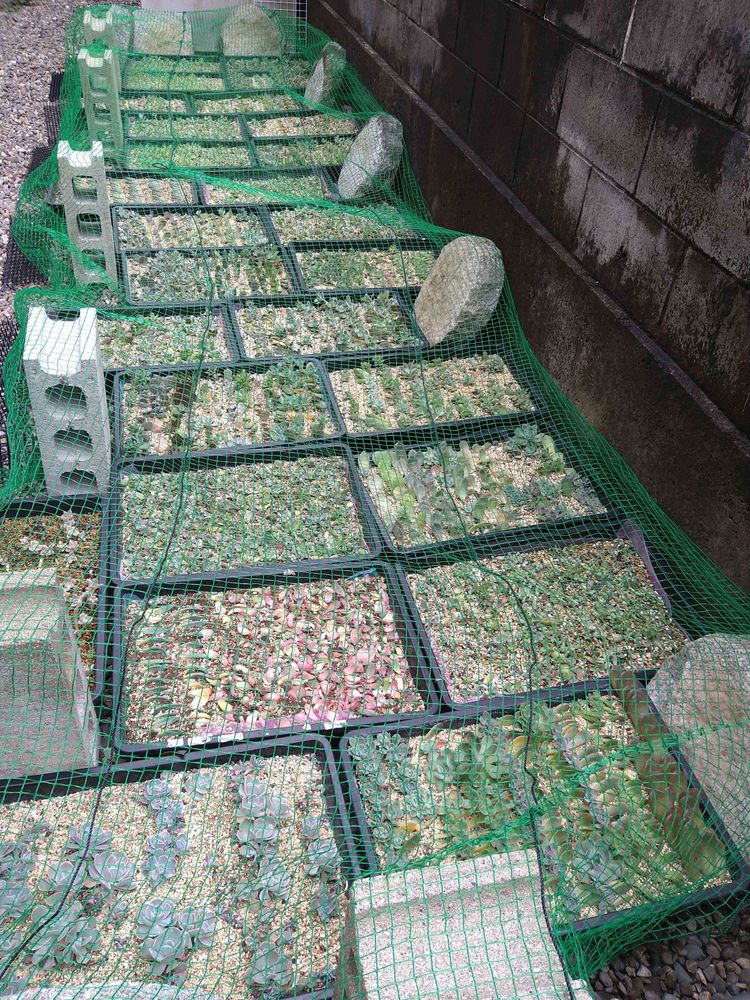 というのも…先日猫対策で移動した葉挿しっ子トレーを並べた棚にあまりにも日が当たらず(棚だと余計に)ずっと気になってはいたものの手を付ける暇もなく…今日やっと午後から時間ができたので、思い切って裏庭に平置きしました❗