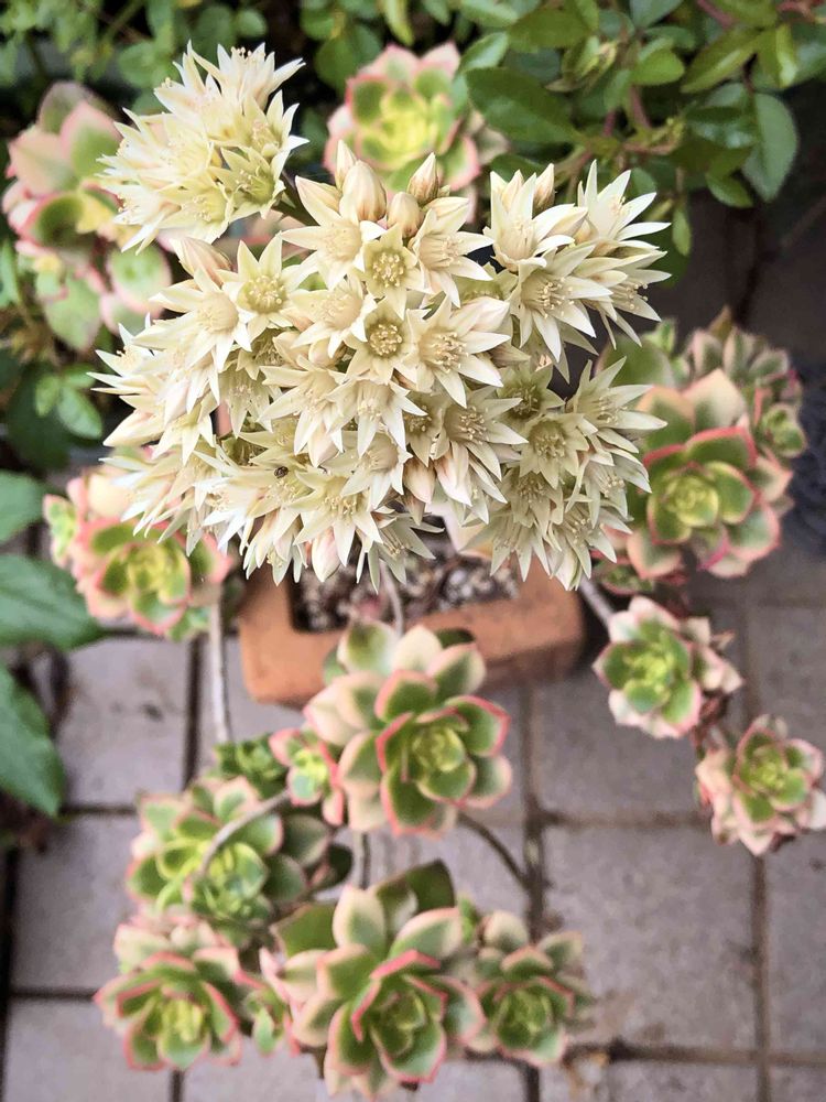 蕾を発見して(2/22にup)から開くまでに2ヶ月以上経ち、アエオニウム キウイ🥝の花が満開になりました🌼🌼🌼🌼🌼