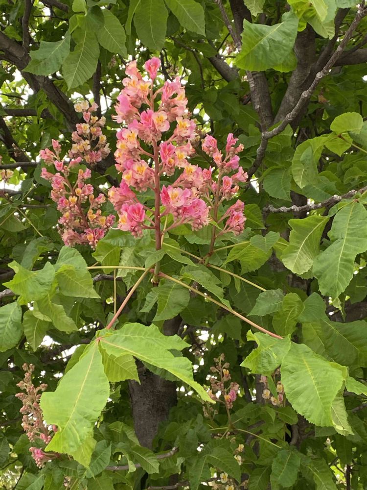 紅花栃の木が近所のショッピングセンターの駐車場で咲いています。よく目立つ花が印象的です。樹高15mになるそうです。この木は、まだ5・6m。巨木に育つのが楽しみです😄