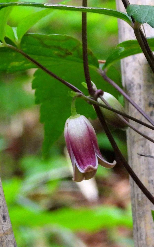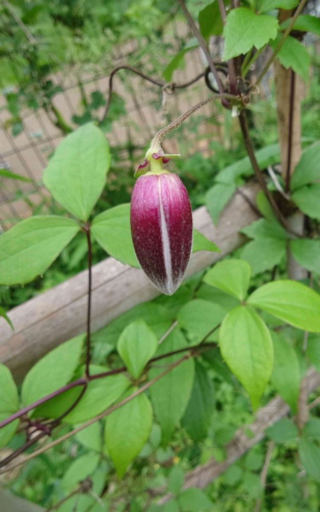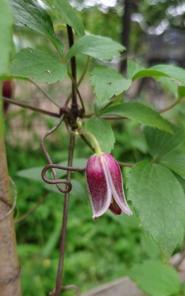 可愛い赤紫色のハンショウヅル(半鐘蔓)の花が咲き始めていました。