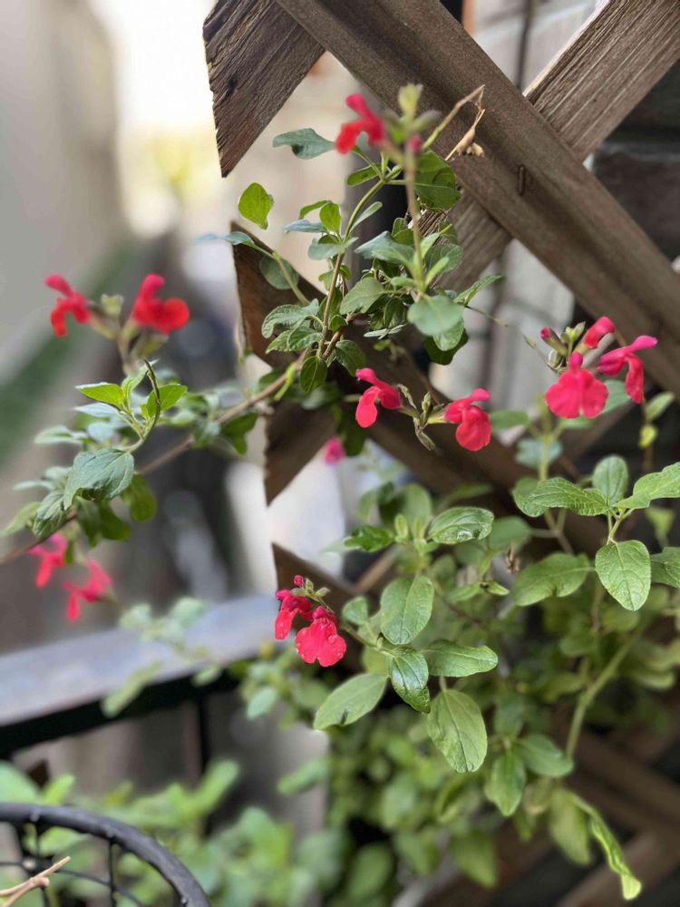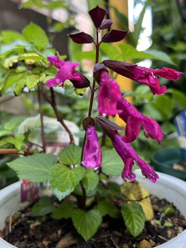 💜のと赤いのは、セージでしょうか??複雑なお色の葉は、アジュガさん?お花が何処かにありますかね?