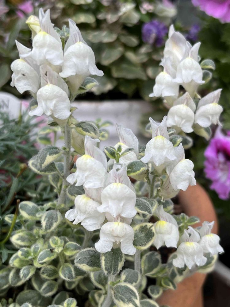 白い斑入りのお花はキンギョソウムーンライトトリニティです。葉っぱがモフモフで可愛くて大型園芸店で昨年購入しました😊