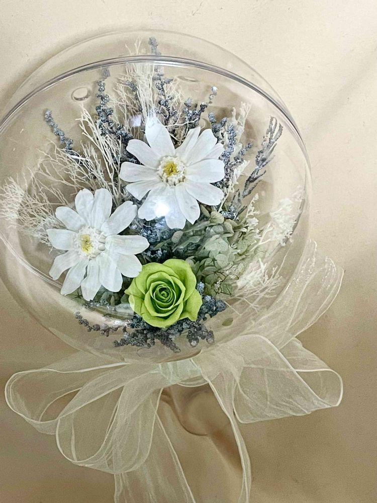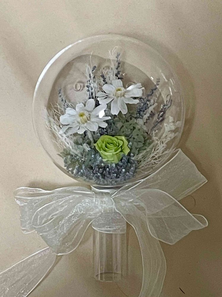 バルーン型のアクリルケースにジニアやバラを入れた可愛いアレンジ🥰