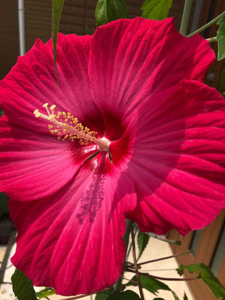 花の名前はタイタンビカス。見た目はハイビスカスに似ているけど違う品種で、今年思わず買ってしまいました😀。大人の手のひらより一回り大きい花を咲かせてくれます。存在感ありますね🌺