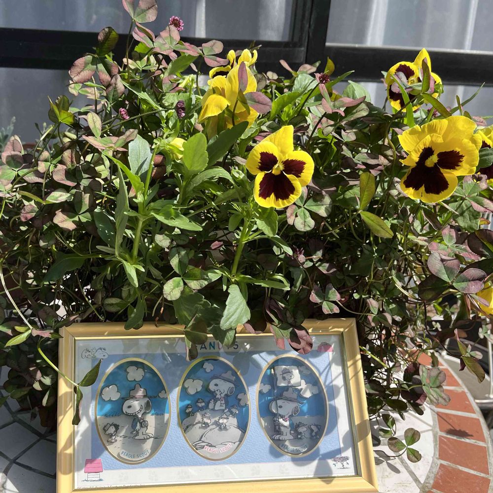 ①少し見辛いですが😅娘の部屋に飾ってあるのをついこの間気が付きました😆なんていうのかな、何重かに作ってある作品?スヌーピー額と、ポニータとクローバー🍀花も咲いてきました。