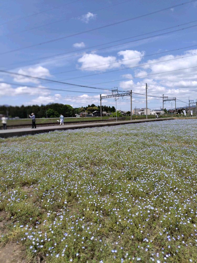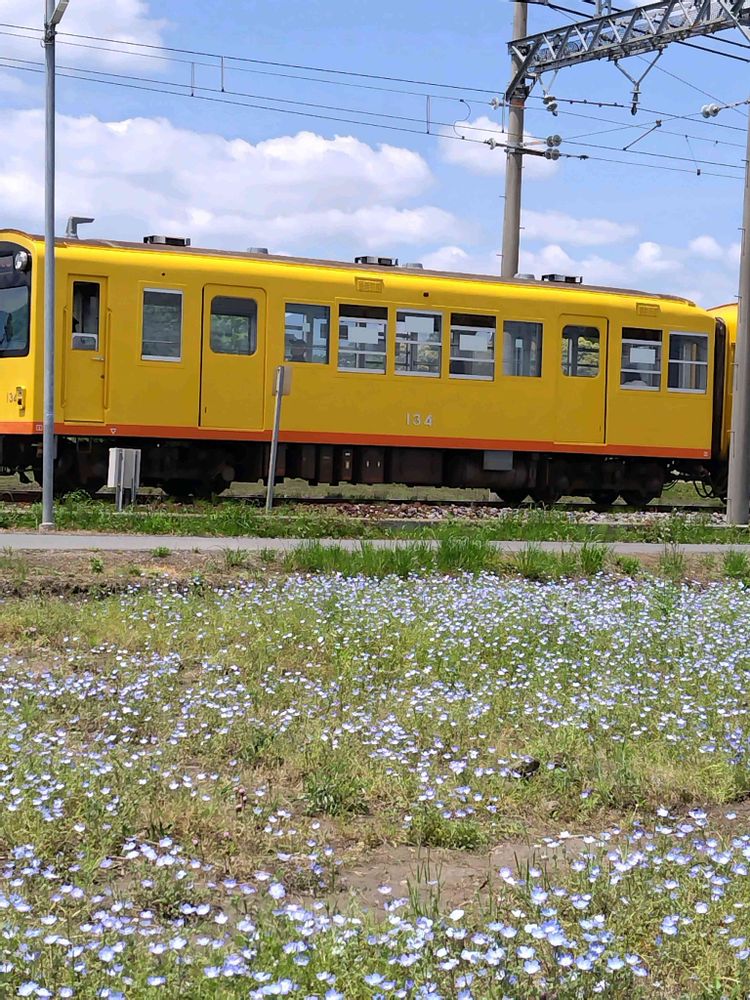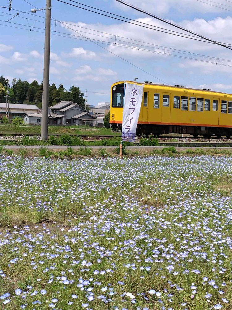 小さなネモフィラ畑なんだけど、側を通る黄色い🚃とのツーショットがとても綺麗で📺で観たので行ってみたよ😊