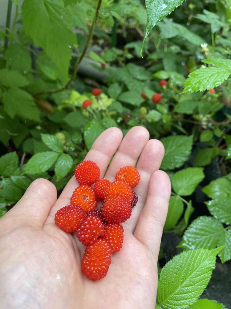 クサイチゴとオオバライチゴを収穫しました、隠れていますが色が濃いのがオオバライチゴです。