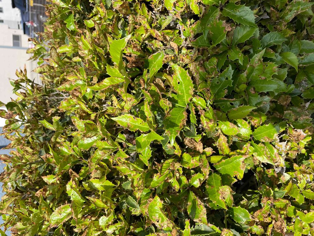 ヒイラギモクセイ、で合ってますか?よく生垣で見ます、このように虫にやられている事もあります。