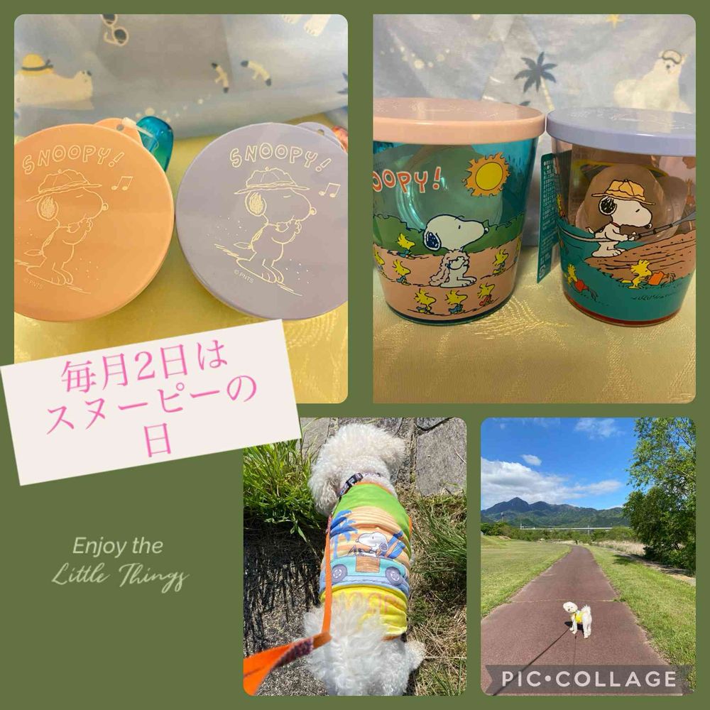 ③娘に貰ったSNOOPYのゼリーカップとSNOOPYの服を着ている🐶