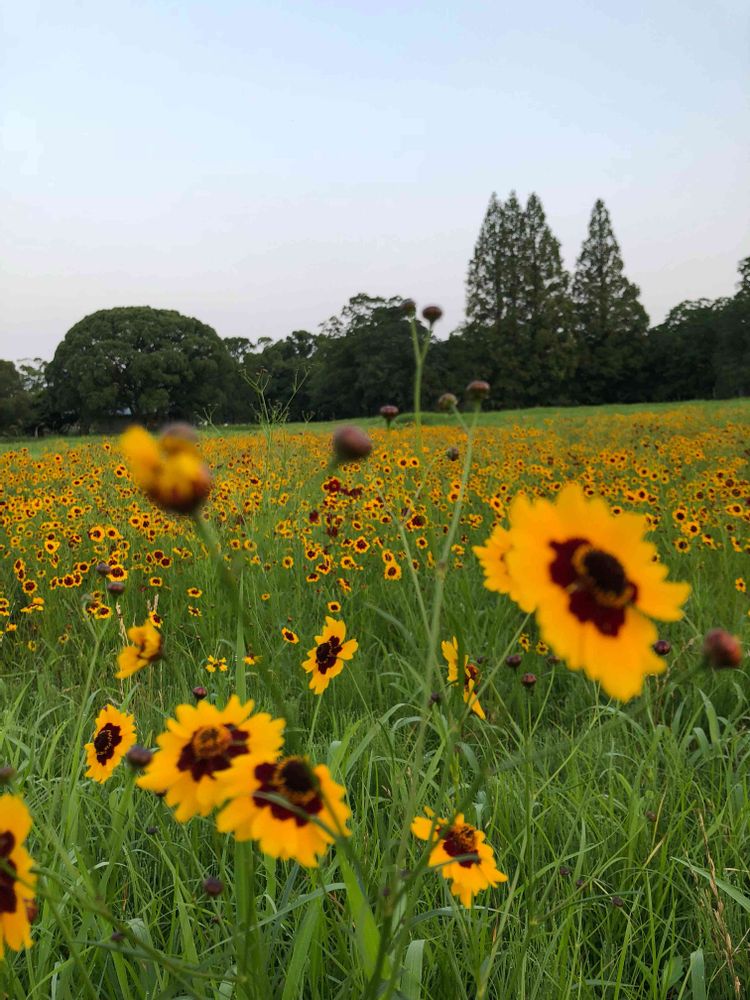 秋は一面コスモスの花におおわれる原っぱです。今は黄色のじゅうたんになってます!