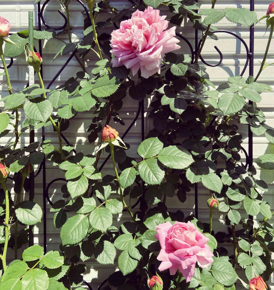 ムーランドラギャレットも、いくつか咲き始めました♪花弁がたくさん🩷フェンスを立てかけて誘引中です😊