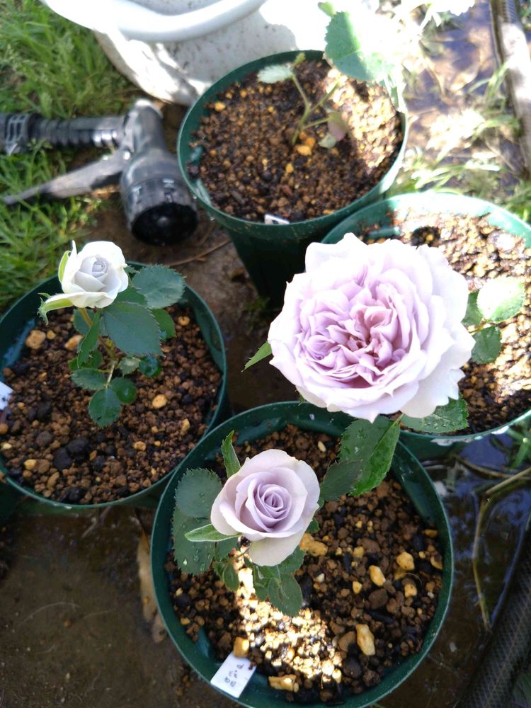 実生のバラを順次鉢増ししてます。最初の開花の時点でそれぞれ個性が出てます。