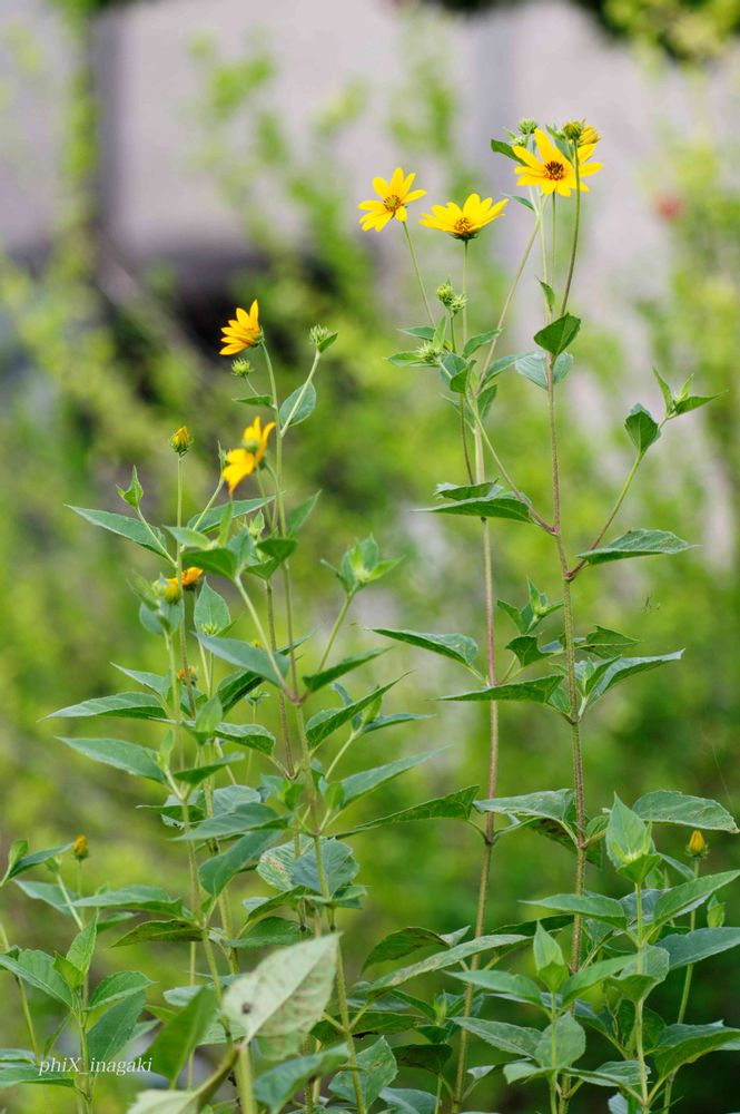昨晩あぴさんに名前を教えて頂いた,花をもう一度見てきました。葉っぱが細くて小さいと思っていましたが,下の方の葉が大きくて♡型の細長い,宿根ヒメヒマワリであると納得できました。花の部分だけ大写しにしてしまったので,花の付く柄がすごく長い感じだったのですが,実際にもう一度見るとそうでもありませんでした。