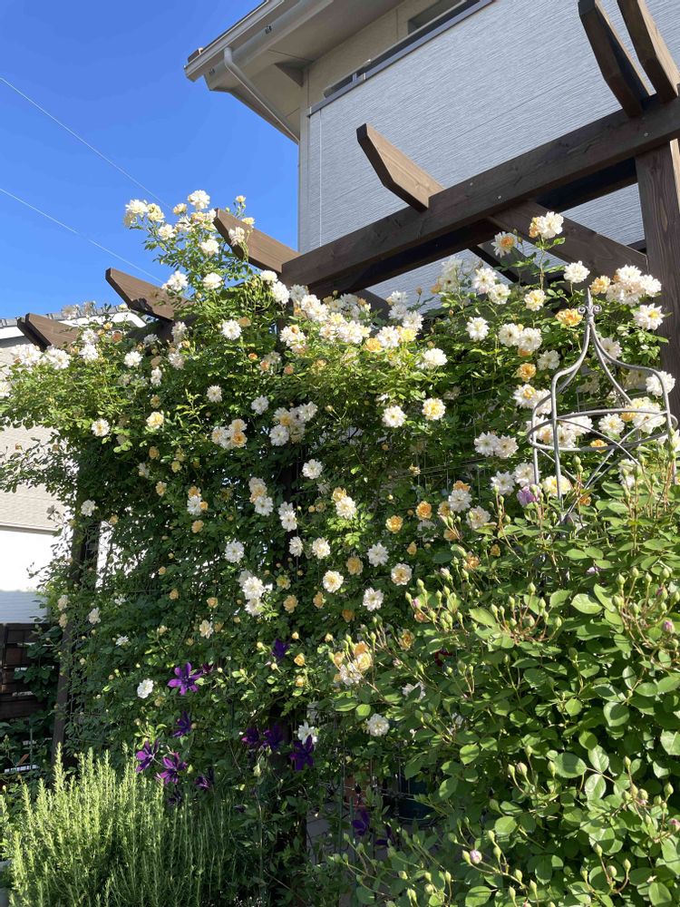 ①パーゴラのフェリスバイド🌹一気に咲いてとても華やかです🧡🤍
