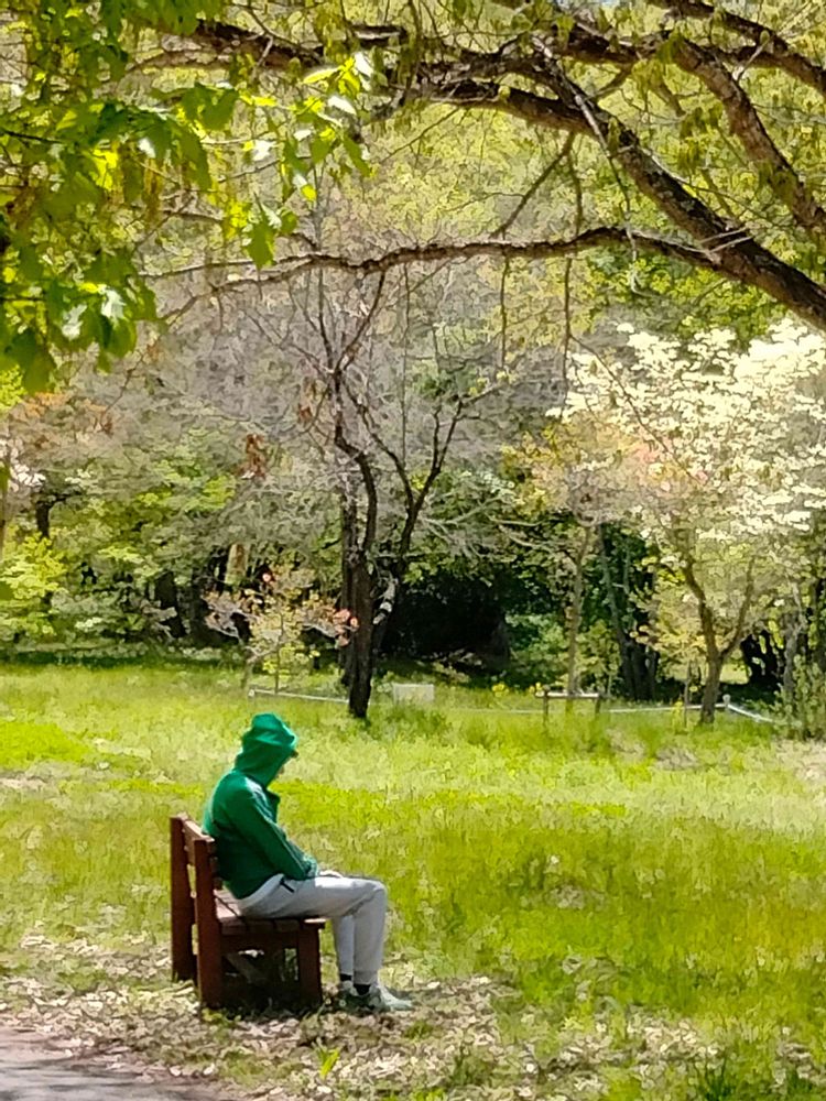 ズボンも緑色なら、水から上がって日向ぼっこしてる河童に見えなくもないですね。