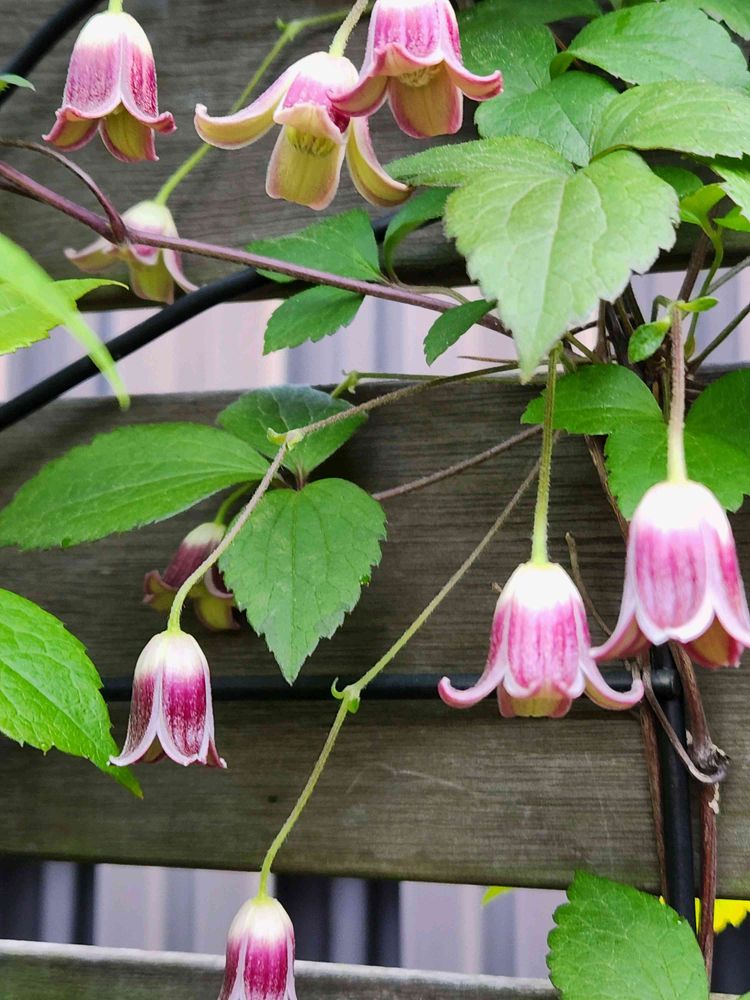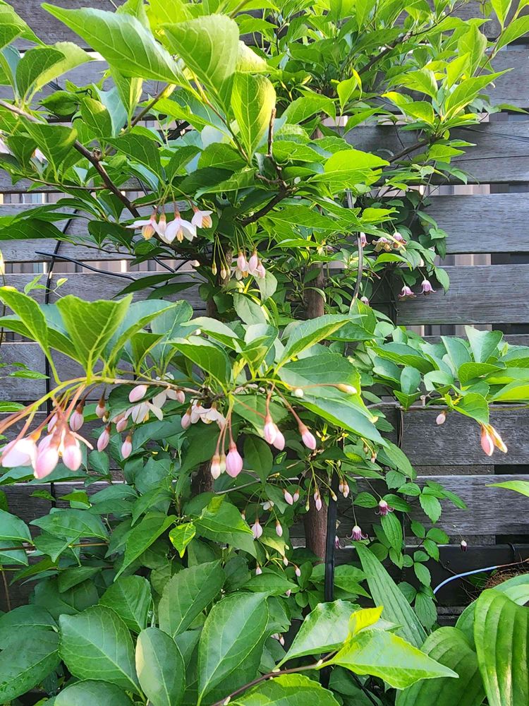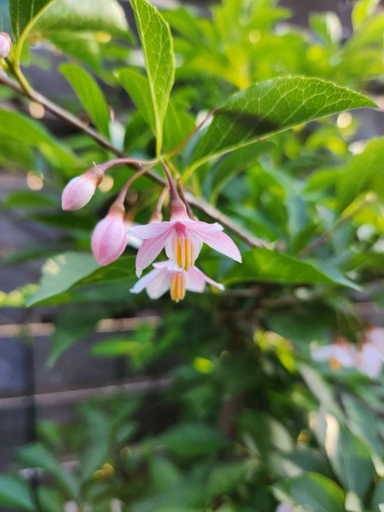 今朝の庭、ピンクエゴノキが咲き始めました。後ろ側にハンショウヅルも、同じ様に下向いて咲いています。🔔🔔