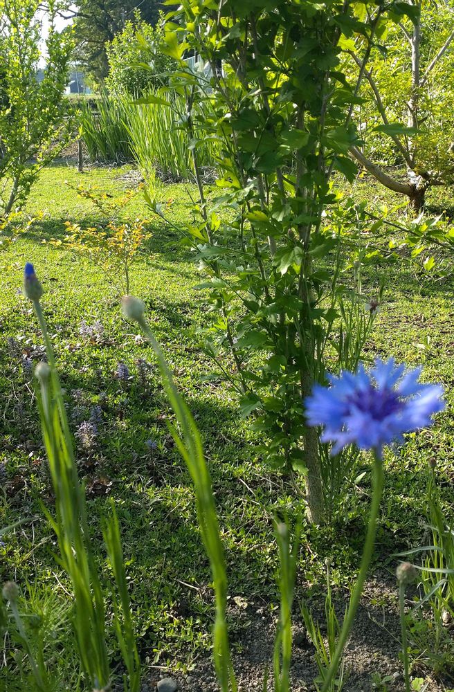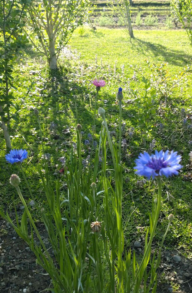 鮮やかなブルーの矢車菊に、背景の芝生が引き立つなぁと思って見てました。