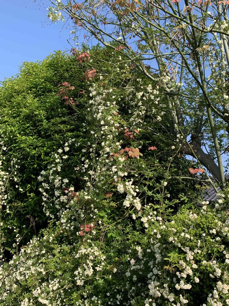 その高い木の梢近くまで、蔓を伸ばして、白い八重咲きの美しい花をたくさん咲かせています。😘