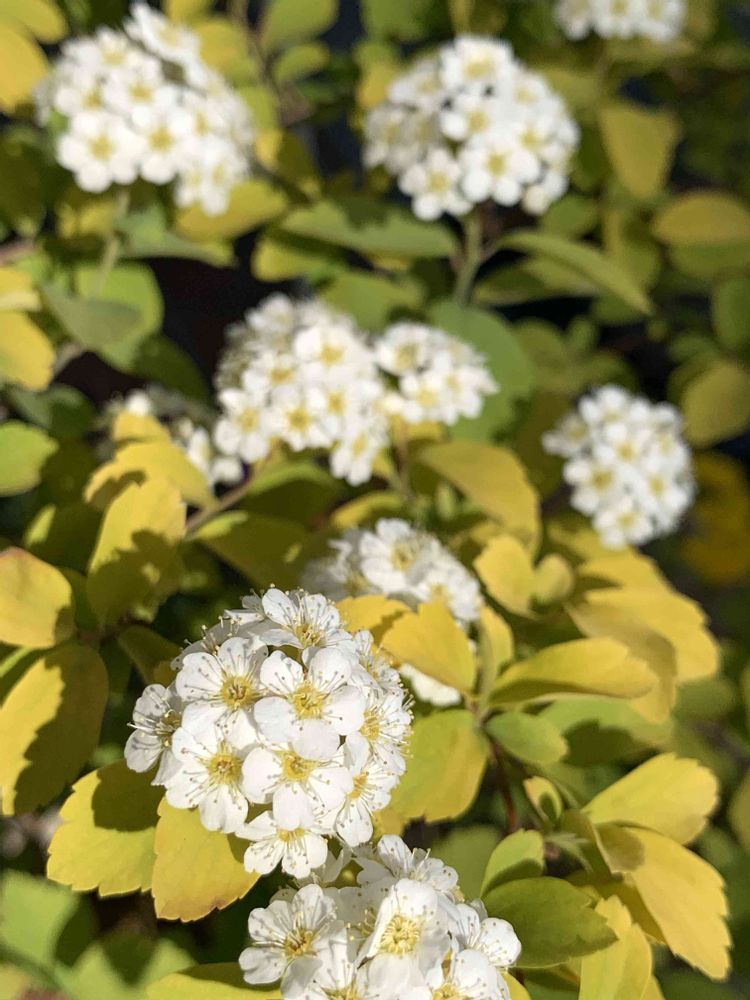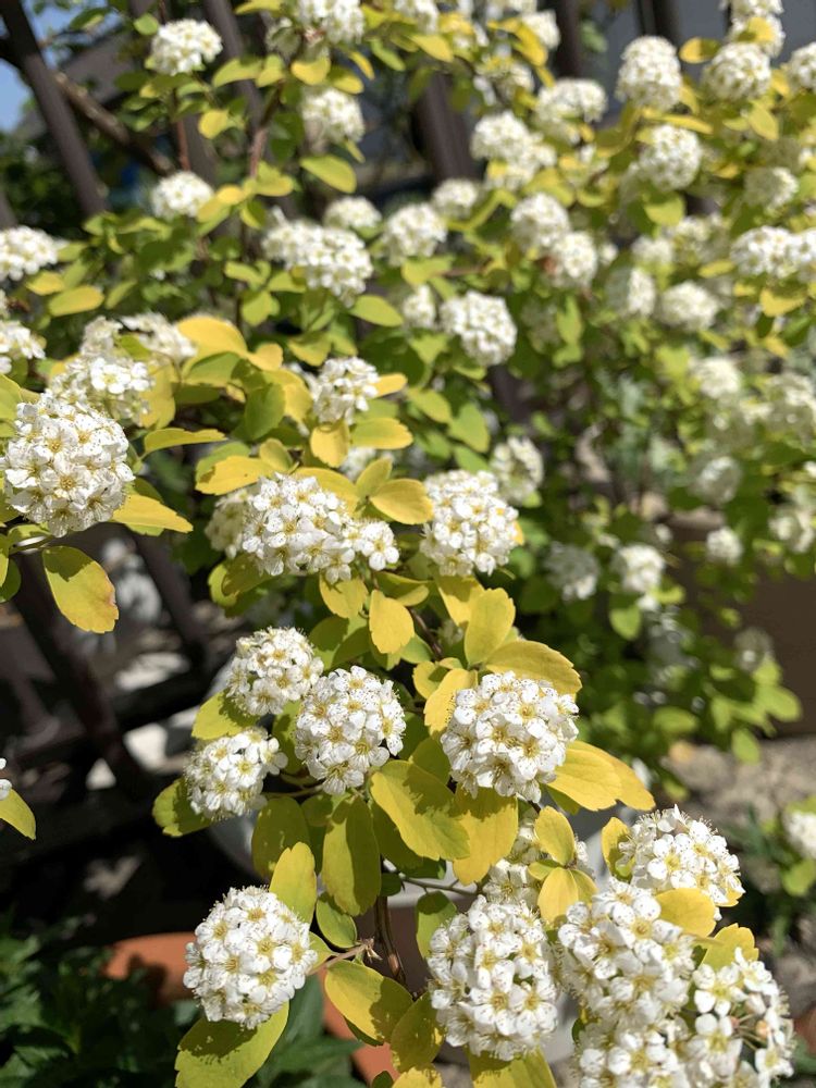 3年目のコデマリゴールドファウンテン!白い花が可愛らしく咲いています☺️太陽の光で黄金葉も輝いています☀️☺️