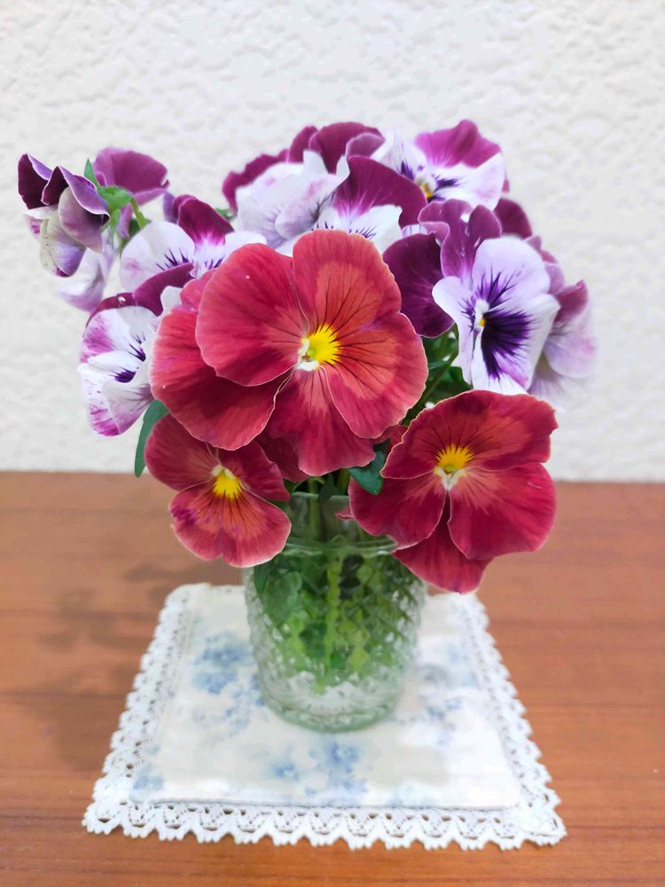 何とも言えないレンガ色のパンジーが咲いていました。ケース見切り品にエンジ色がたくさん入っていましたが珍しい色が混ざっていたのね。ブーケに💐