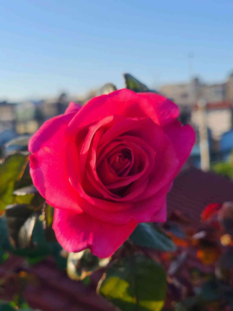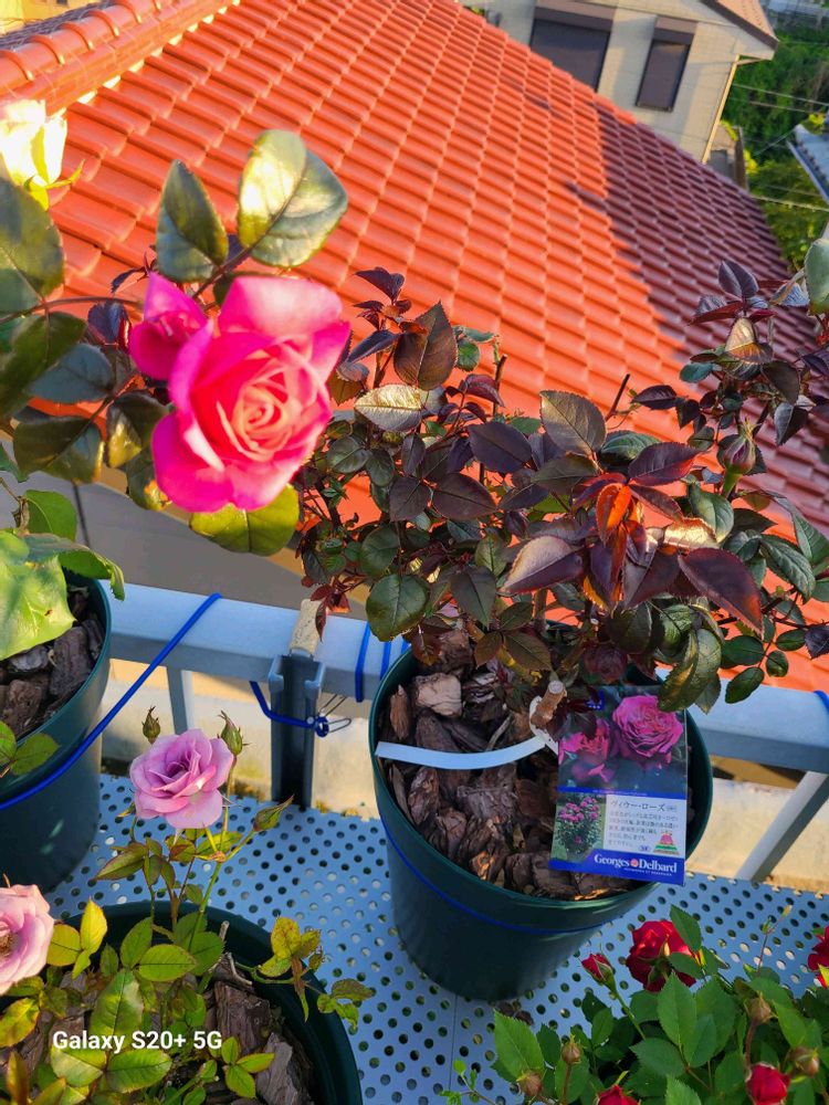 奥に映り込んでいるお宅の屋根の感じと薔薇がマッチしてプロバンス風に見えます💞