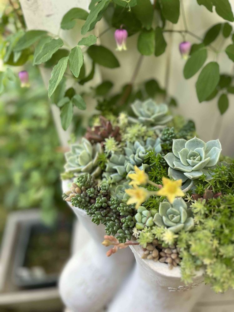 ツボ型クレマチスと多肉。秋に寄せ植えした多肉はセダムに飲み込まれていました。春先にカットして良い感じです(๑´・ᴗ・`๑)