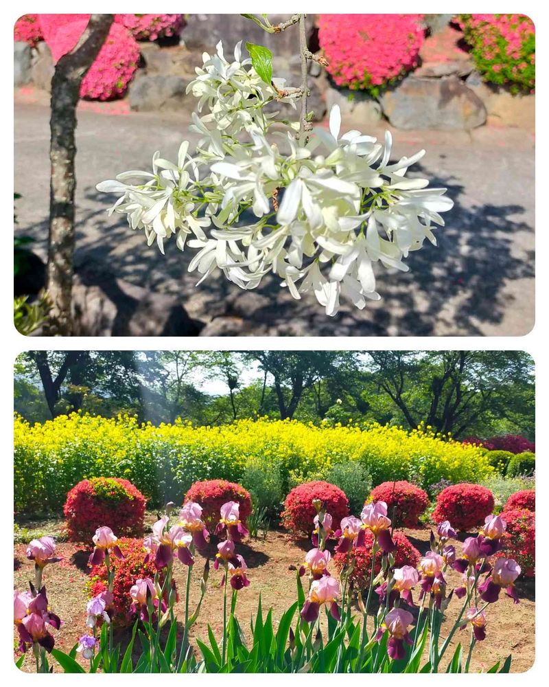 菜の花💛ツツジ❤️ジャーマンアイリスの楽しそうな(♡ω♡ ) ~♪コラボ(*^3^)/~♡