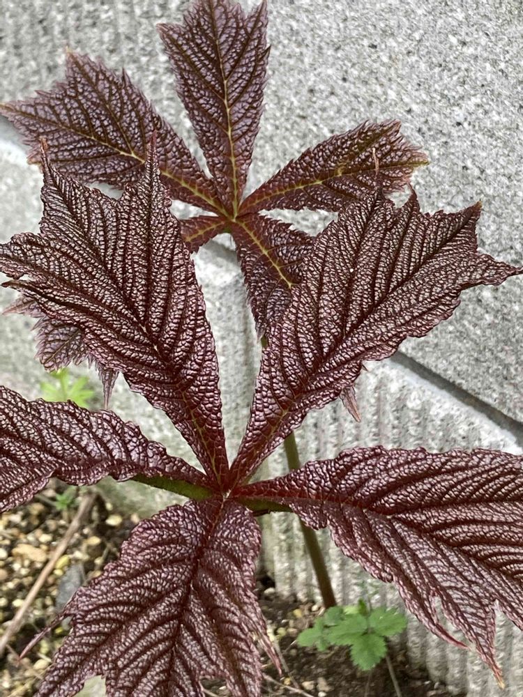 春の小花達が咲く中 傘みたいに大きい銅葉