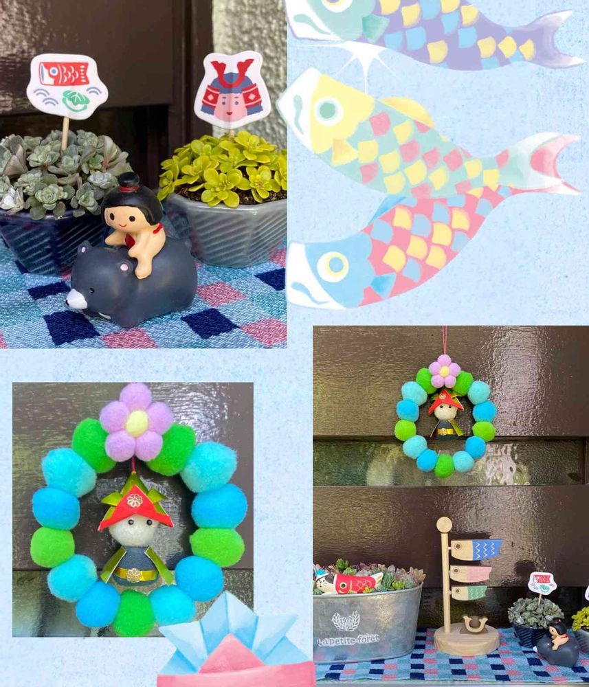 2️⃣セダム寄せ植えに子供の日ピックを刺してみました🤭ボンボンリースも作ってみました🟢🔵🟣