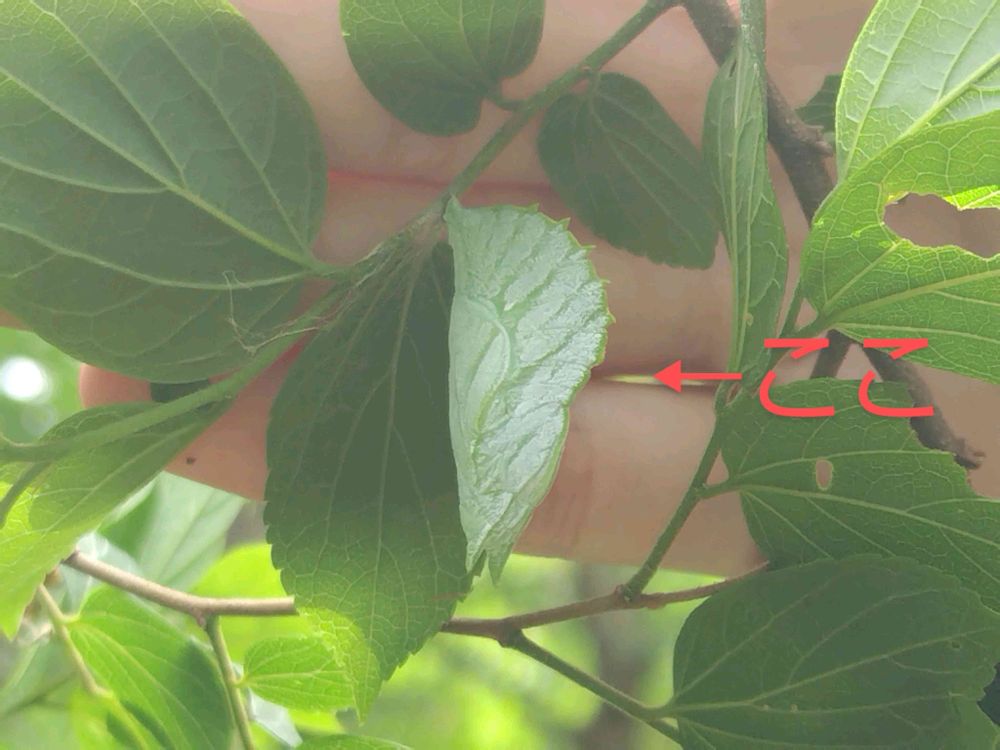 そして写真4枚目ですが、この葉っぱの中に蝶の蛹がいるんです🧐