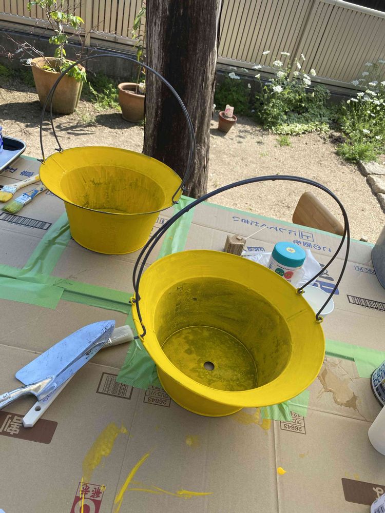去年の元気印の黄色いブリキの鉢が、すっかり色褪せて錆びてしまったので、おそろを差し上げた友達宅でペンキ塗りかえました。