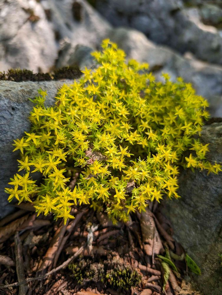 石灰岩の露出する山頂付近はユズリハ群落地で今は開花して若葉と古葉が世代交代中。岩の隙間に黄金の輝き 2024.5.5 揖斐川町飯盛山山頂