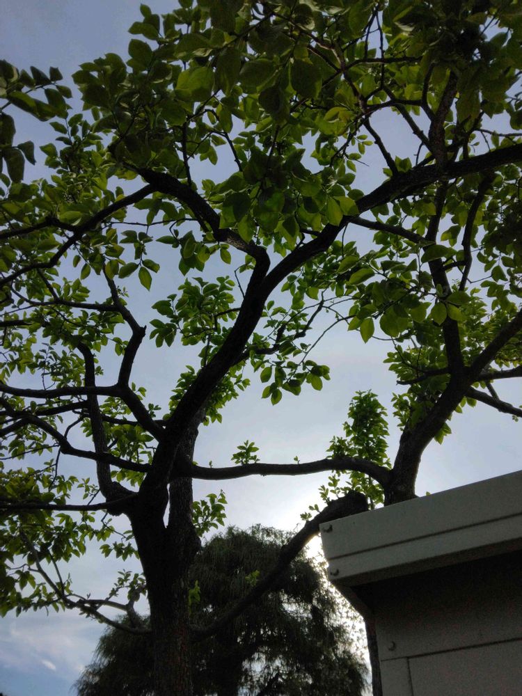 今 庭に出たら柿の木🌲の間から日ざしが