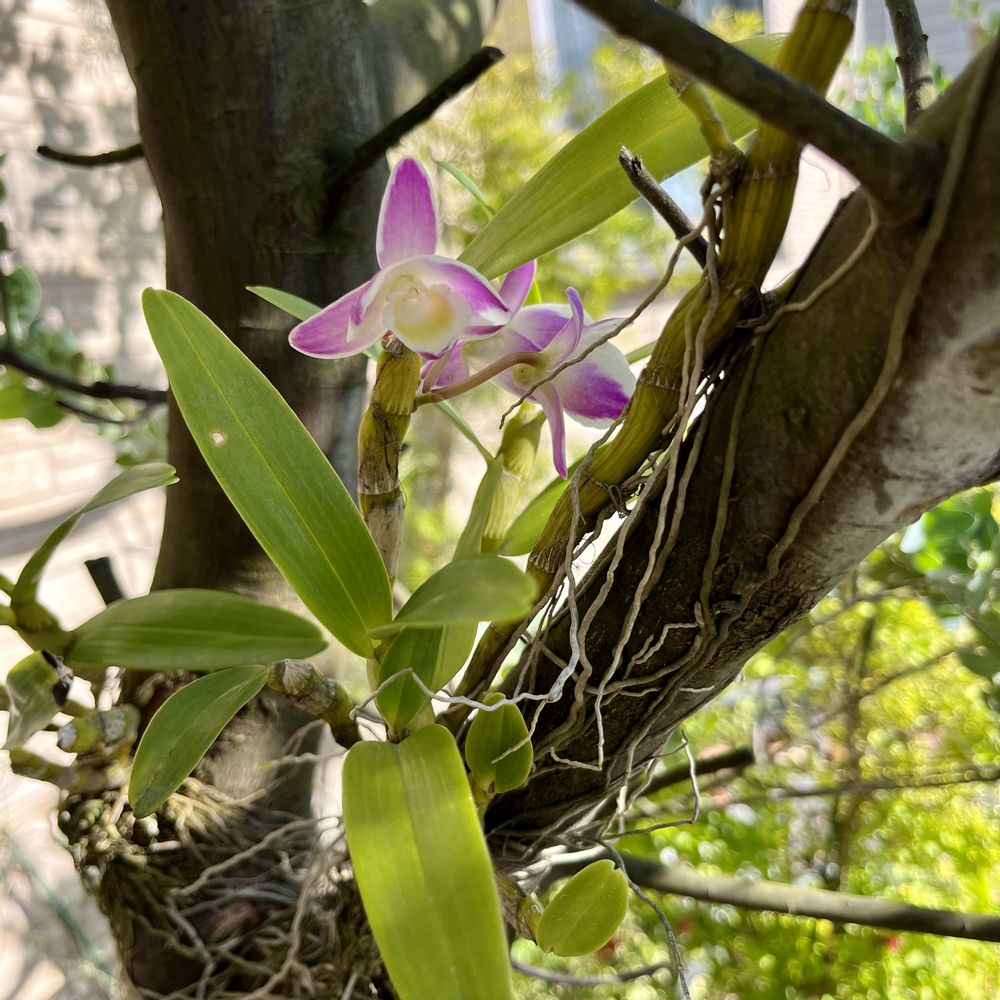 庭木に着生させたデンドロビウム・チャイナドリームクリスタルが開花しました。今年は3輪です。