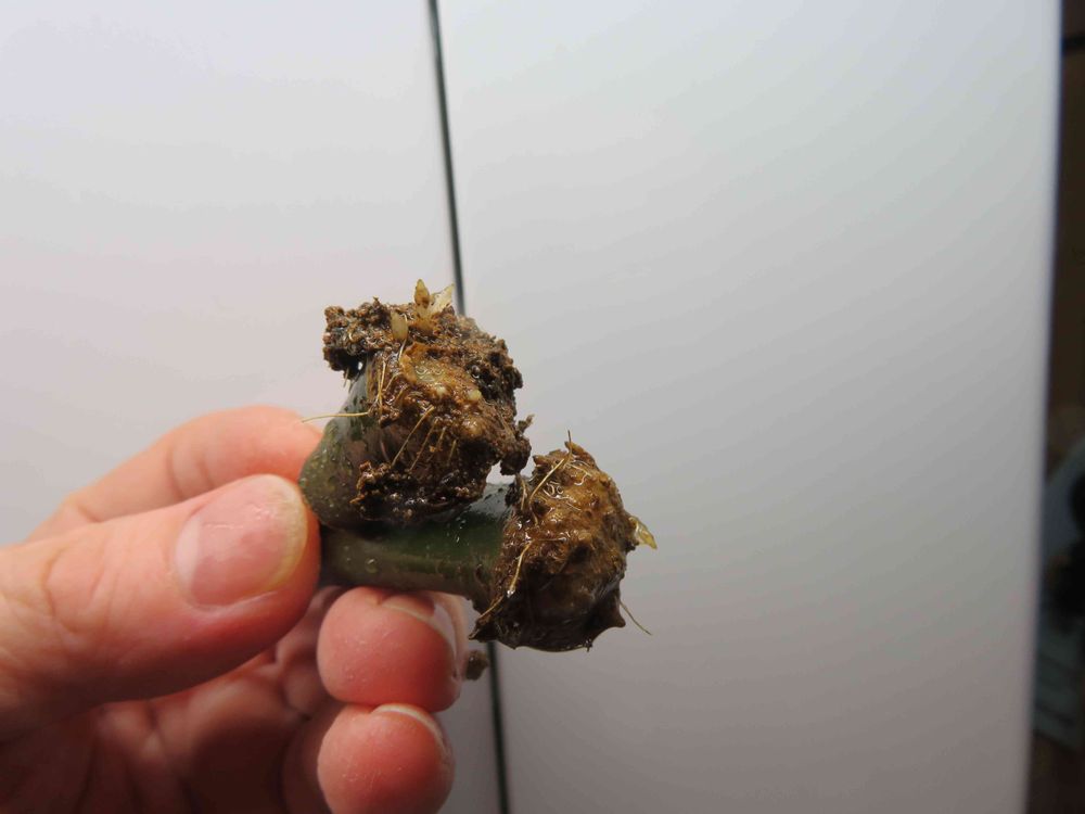 2023年の6月に、南西方位のお店にある久山植木さんで購入したザミオクルカス・レイヴン。家に来て、しばらく生きていましたが、植え替えがあだとなって本体が腐ってしまいました。枝と葉っぱが数枚残っていたので、葉挿しと枝挿しをしておいたのですが、どちらもうまくいかずに諦めました。ほんとうに、真のそこから諦めました。しかし、なんの因果か、まだいけるという2本の枝を見出し、看病を続けていたら、写真ではわかりにくいかもしれないですが、二つとも新しい根っこが生えてきたんです。ここから球ができて新芽が生えれば最高ですね。植え付けは赤玉土で、土が完全に乾いてから少量の水をあげる感じです。普通のザミオクルカスもいますが、こちらは培養土に植えてサスティーで水やりを管理しています。どっちが正解とも言えず、難しいところです。
