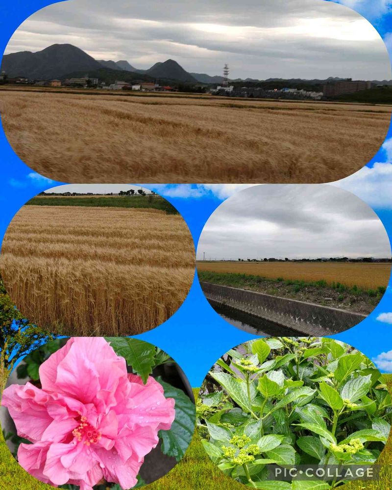 おはようございます☔☁️🤗昨日の宇佐市の田園風景(麦)と、我が家の庭の紫陽花、ハイビスカス🌺🩷です。
