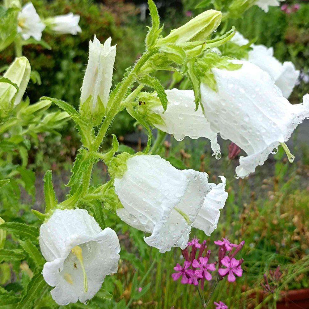 こんにちは☺️☔1ポット98円でホームセンターダイキで購入したカンパニュラさんがpicでは収まらない程大きな株になって沢山蕾をつけてくれてます😍💕まずは真っ先に咲いてくれた所から📸カンパニュラさんもホワイトガーデンの仲間入りです💓ラ カンパネラで有名なピアニストのフジコ・ヘミング永眠されました✚神様の元でも毎日心に響くピアノを演奏され被災された方に元気を取り戻せる調べを空から奏でて下さっていると思います♬
