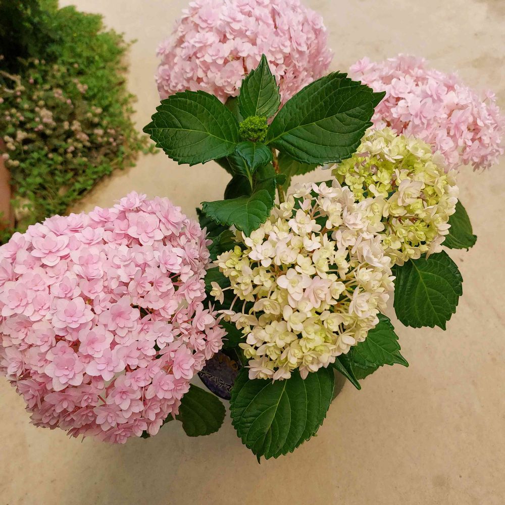 紫陽花が、大きくて、鉢は小さくて倒れちゃう頭でっかち😂そのまま、そっくり鉢増ししないと駄目かも😅